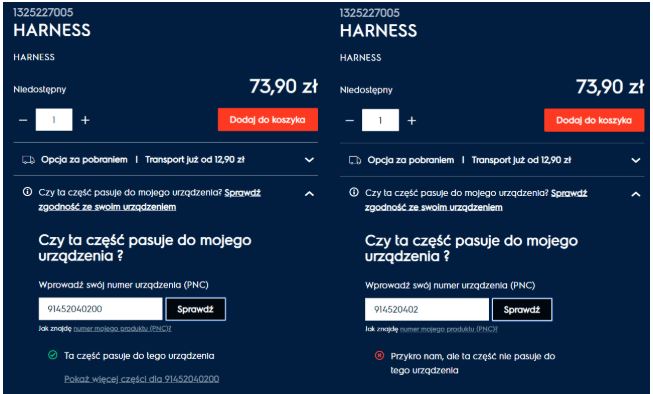 - Mimo że numer części wydaje się prawidłowy, strona wyświetla komunikat że część nie pasuje do urządzenia
