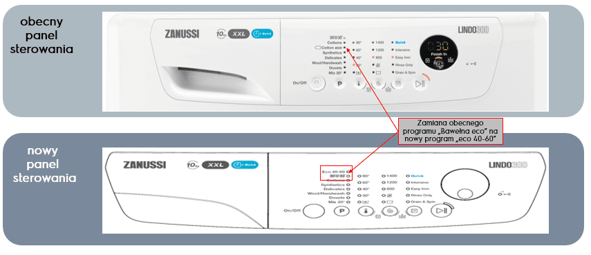 - Jedyna zmiana na panelu sterowania dotyczy dodania obowiązkowego programu "eco 40-60". Zastępuje on bieżący program "Bawełna Eco" już dostępny w urządzeniu. Jedyna zmianą dla klienta będzie zastąpienie jednego programu ekologicznego innym.